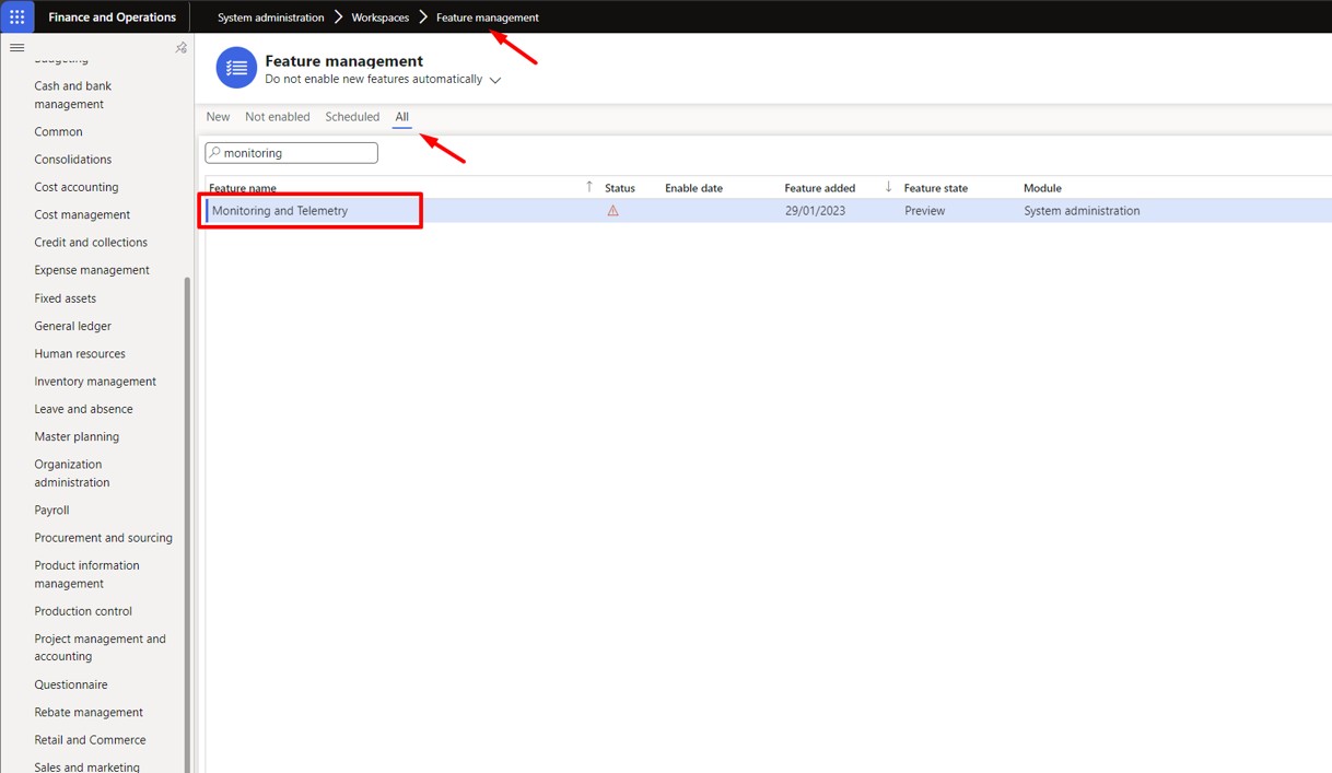 Wait until the resource has been deployed. After that, enable Monitoring and Telemetry feature in D365F&O: